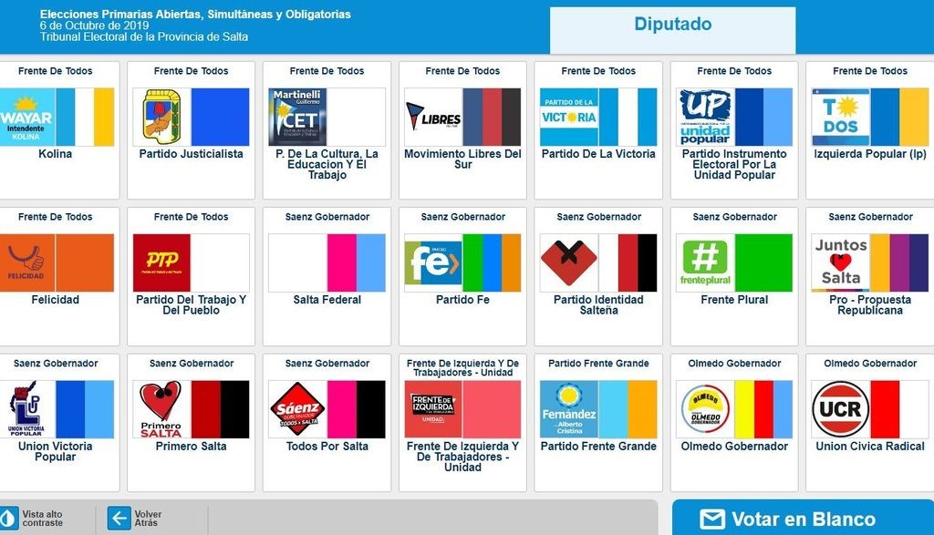Tanto en el caso de diputado por Capital como en el de concejal por la ciudad de Salta, los electores verán en la pantalla solamente los sellos partidarios. En estos dos casos se presentan las pantallas más complicadas de diseñar por la enorme cantidad de precandidatos que se presentaron.