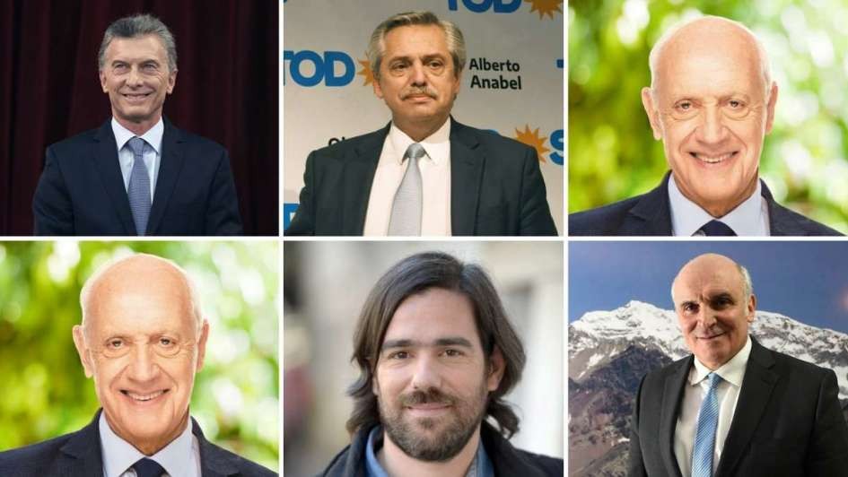 Roberto Lavagna. Consejo Federal.José Luis Espert. Despertar;Mauricio Macri. Juntos por el Cambio;Juan josé Góme centurion. Frente Nos; Nicolas del Caño. Frende de Izquierda-Unidad;Alberto Fernandez. Frende de Todos.