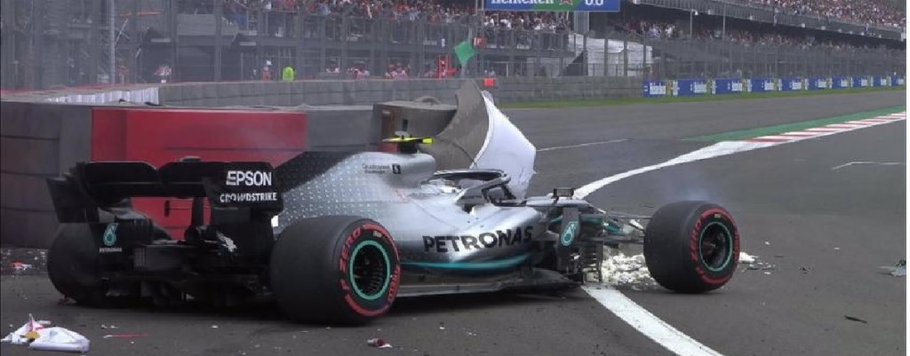 Bottas perdió el control del monoplaza en la última curva del circuito del Autódromo Hermanos Rodríguez y se estrelló con el muro de contención. Tenía grandes chances de quedarse con el primer lugar, pero quedaron dilapidadas por su duro golpe en la pista.