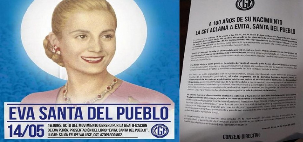 En el marco del centenario del nacimiento, la Confederación General de Trabajadores (CGT) pidió al Vaticano la beatificación de Eva Duarte de Perón.
