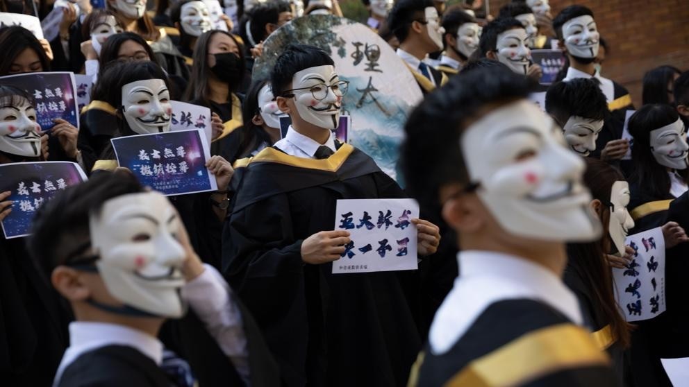 Un grupo de estudiantes de la Universidad Politécnica de Hong Kong con máscaras de Guy Fawkes.Foto:Jerome Favre