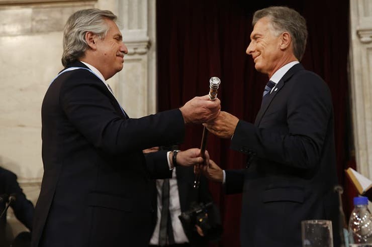 El mandatario saliente Mauricio Macri le entregó los atributos presidenciales al flamante jefe de Estado, Alberto Fernández, que hoy comienza su mandato después de jurar ante la Asamblea Legislativa.