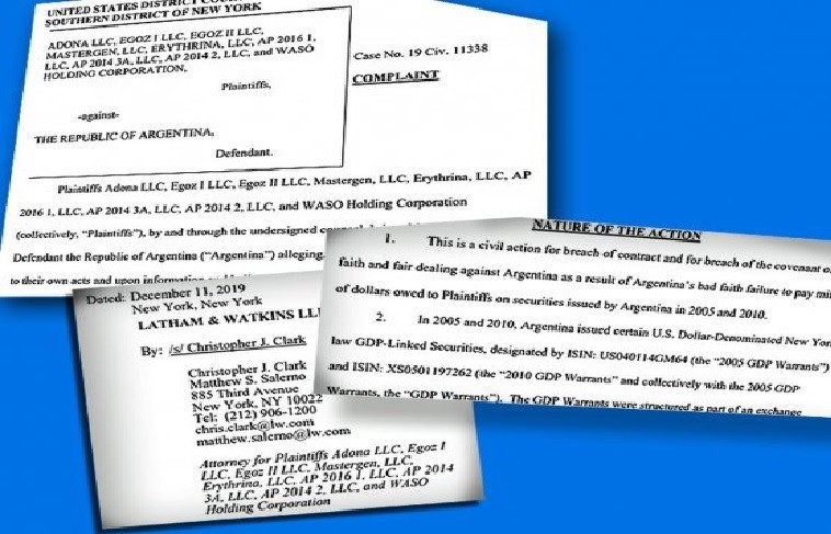 En todos los casos lo que se reclama es por supuesta “mala fe” del país al alterar la medición del PBI del INDEC para el ejercicio 2013, siguiendo la primera demanda que realizó el fondo Aurelius y su firma cautiva uruguaya Novoriver, al que se le habían sumado hasta noviembre otras tres casas de inversiones europeas. Ayer, esperando estratégicamente al día posterior a la asunción de Alberto Fernández, se incorporaron al mismo reclamo tres fondos buitre ignotos, y nunca registrados como tenedores de los bonos emitidos durante el canje de deuda lanzado en 2005 en el Gobierno de Néstor Kirchner.