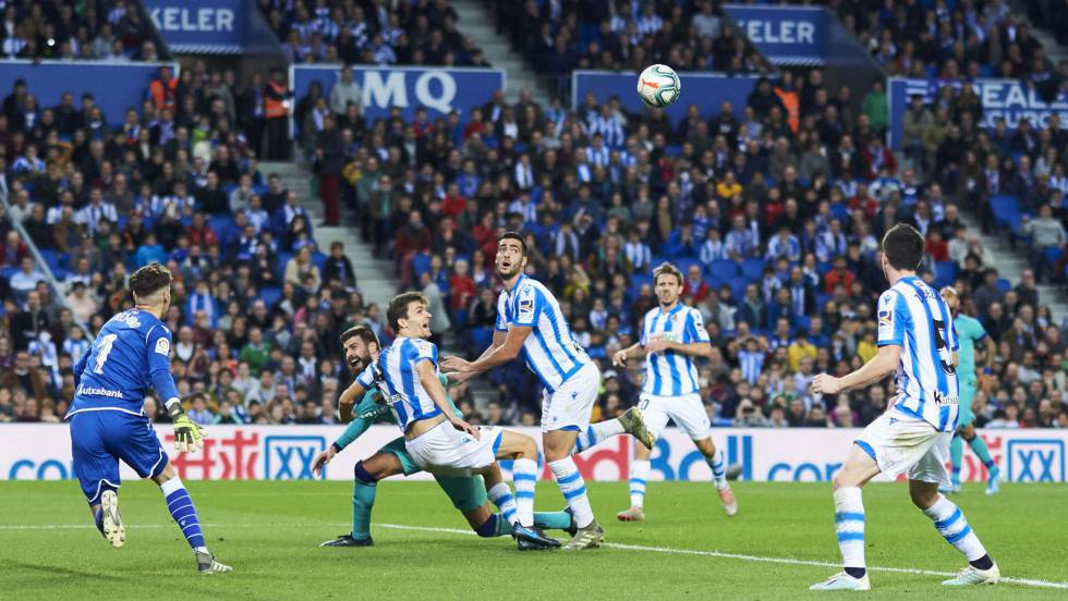 Nada evitó, sin embargo, que la Real Sociedad se avanzara en el marcador. Busquets agarró con poca gracia a Llorente a la salida de un córner. Lo hizo con el árbitro como espectador privilegiado y sin demasiado disimulo. Nada que objetar al penalti, si no fuera porque no hay saque de esquina en que no se repitan esas mismas escenas sin castigo de por medio. Oyarzabal, responsable del disparo desde los once metros, dejó sentado a Ter Stegen mientras clavaba la mirada hacia una derecha que no fue tal.