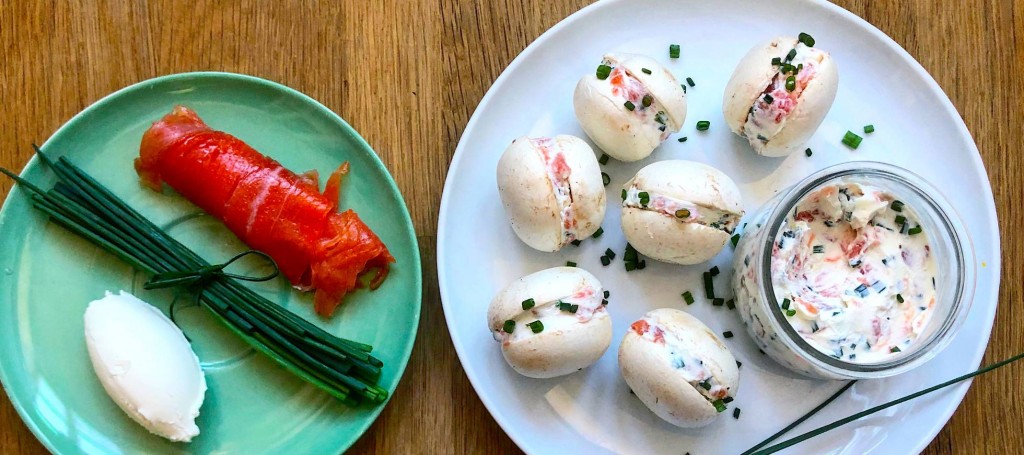 Quitarles el pie a los champiñones y cortarlos por la mitad para que queden como la mitad de un macaron (reservar lo que no usemos para otras preparaciones). Rellenar con la crema de queso, salmón y cebollino y servir.