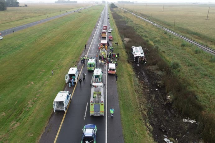 El siniestro ocurrió antes de las 5, poco antes de amanecer, en un escenario dominado por lloviznas y niebla. El vehículo, de dos pisos de la empresa Rutatlántica, quedó recostado sobre su lateral derecho, a unos 15 metros de la banquina y en una zanja, a más de un metro por debajo del nivel de la calzada.