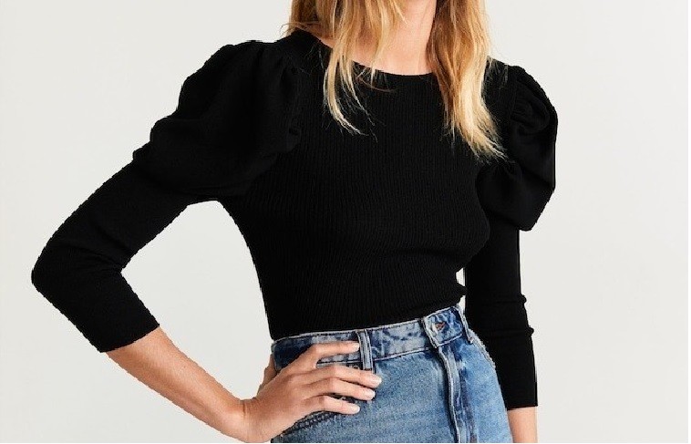 Jersey negro de punto de canalé con mangas abullonadas muy fácil de lucir con todo tipo de prendas de día y de fiesta. Su precio es de