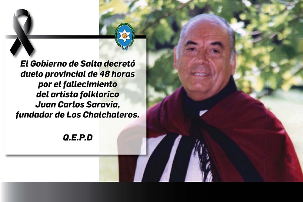 Hondo pesar produjo la noticia del fallecimiento de Juan Carlos Saravia, fundador del conjunto Los Chalchaleros. Por tal motivo, el Gobierno de la Provincia de Salta decretó Duelo Provincial por 48 horas.