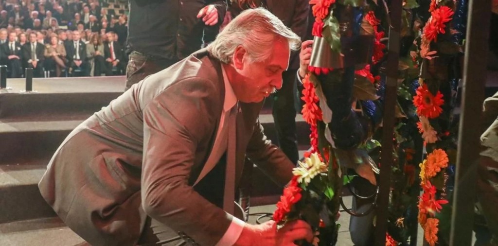 Alberto Fernández coloca una ofrenda floral por las vÃctimas del Holocausto, en el Foro Mundial en Jerusalén. Foto:Presidiencia