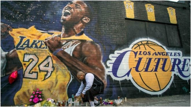 Una persona enciende una vela ante un mural con la imagen de Kobe Bryant.