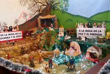 A un lado del belén están colocadas, entre otras, las figuras de 'Iván Márquez', número dos de las Fuerzas Armadas Revolucionarias de Colombia (FARC), el narcotraficante Pablo Escobar y el dictador alemán Adolf Hitler. En el otro extremo, el papa Francisco comparte mesa con personajes como el expresidente de Sudáfrica Nelson Mandela o la figura central del movimiento de independencia indio, Mahatma Ghandi.