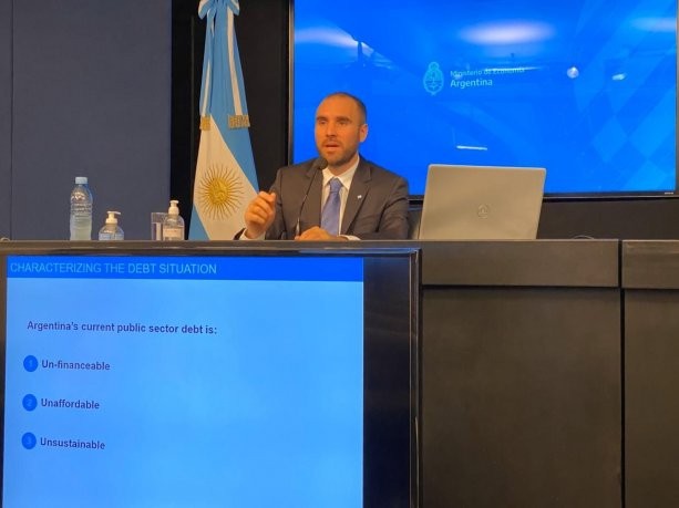 Guzmán describió a la deuda argentina como "infinanciable, impagable e insostenible". Fue entonces cuando el ministro recordó que, pese a esas características, con venia del Congreso y por la ley de Solidaridad Social y Reactivación Productiva, se siguieron pagando intereses de la deuda en dólares con reservas del Banco Central. "Eso mostró el compromiso de la Argentina", señaló. "Esto no puede durar para siempre", indicó luego.