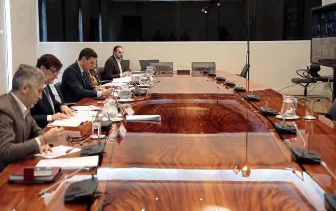 El presidente del Gobierno español, Pedro Sánchez (3-i), acompañado por los ministros de Interior, Sanidad, Defensa, y Trasportes, en la videoconferencia