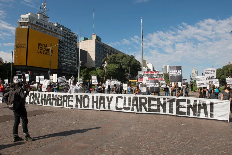 Cubiertos con tapabocas y alcohol en gel, los manifestantes infringieron el aislamiento preventivo y social con protestas en todo el país para exigir un aumento en los recursos económicos destinados a la población más vulnerable.