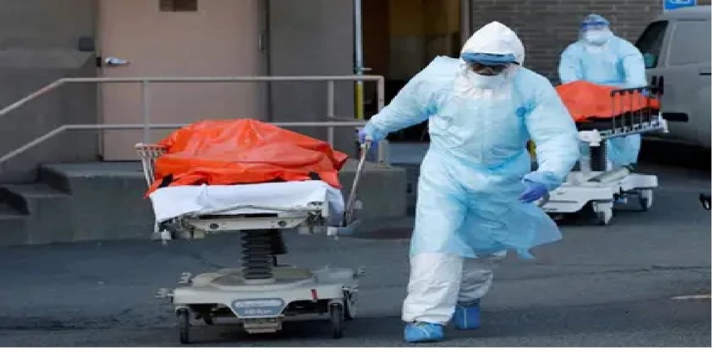 Trabajadores de la salud transportan cuerpos de personas fallecidas por COVID-19 del Centro Médico Wyckoff Heights, Nueva York, EEUU. Foto:Crédito