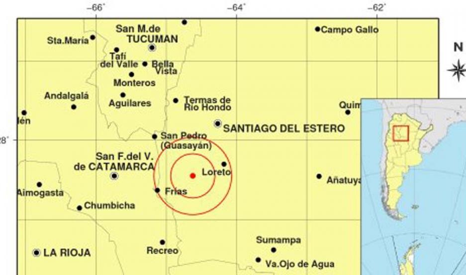 El organismo nacional detalló que el epicentro fue a 81 km al SO de Santiago Del Estero; 110 km al E de San F. Del Valle De Catamarca; 47 km al O de Loreto -28.450 (lat) -64.622 (long).