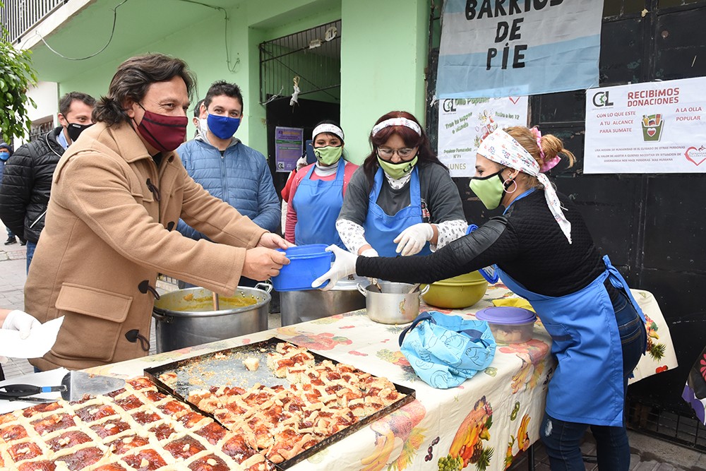 Durante su visita, Sáenz saludó y dialogó con todos los vecinos que cumpliendo los protocolos sanitarios esperaban para llevar su vianda que en esta oportunidad constaba de locro y pastafrola.