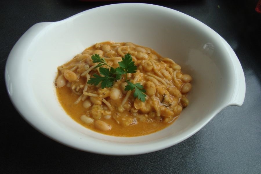 Separar la mitad del potaje y licuarlo hasta conseguir una especie de crema. Verter a la olla con el resto de la preparación y revolver, dejando que hierva. Apagar.