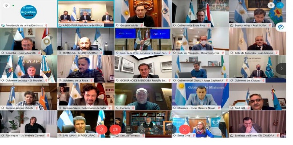 En la videoconferencia que mantuvieron con el Presidente estuvieron Horacio Rodríguez Larreta (CABA); Axel Kicillof (Buenos Aires), Jorge Capitanich (Chaco), Raúl Jalil (Catamarca), Mariano Arcioni (Chubut), Gustavo Valdés (Corrientes), Juan Schiaretti (Córdoba), Alicia Kirchner (Santa Cruz), Gustavo Bordet (Entre Ríos), Gildo Insfrán (Formosa), Gerardo Morales (Jujuy), Sergio Zilliotto (La Pampa), Rodolfo Suárez (Mendoza), Ricardo Quintela (La Rioja), Oscar Herrera (Misiones), Omar Gutiérrez (Neuquén), Arabela Carreras (Río Negro), Gustavo Sáenz (Salta), Sergio Uñac (San Juan), Alberto Rodríguez Saá (San Luis), Omar Perotti (Santa Fe), Juan Manzur (Tucumán), Gustavo Melella (Tierra del Fuego) y Gerardo Zamora (Santiago del Estero).