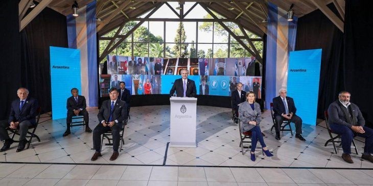Con una pantalla detrás que mostraba imágenes de todos los mandatarios desde sus provincias, Alberto Fernández añadió: "Prometí que el Gobierno iba a ser de un Presidente y de 24 gobernadores, que están hoy junto a mí unidos y trabajando para enfrentar lo que nos toca vivir". Luego, nombró y agradeció a cada gobernador.