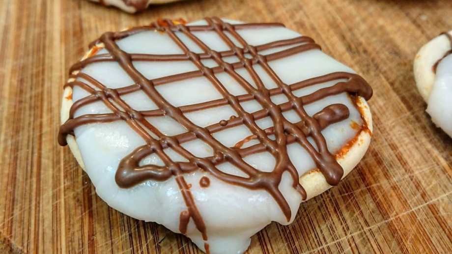 Formar la masa. Dejar descansar por 30 minutos a 1 hora en heladera (el ron se puede reemplazar por agua). Estirar con palo de amasar y cortar con cortante circular de 4 cm. Pinchar con tenedor y dar forma alargada. Colocar en placa enmantecada y llevar a horno bien caliente 200° C por 10 minutos. No se tienen que dorar. Una vez frías armar con dulce de leche repostero mezclado con los chips de chocolate y glasear.