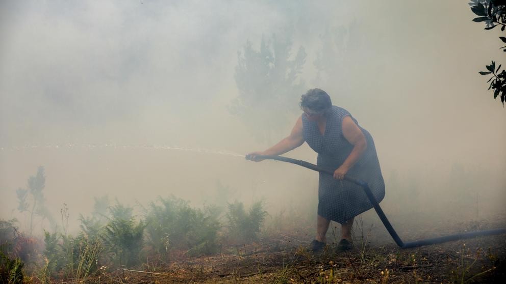 Una mujer combate las llamas en el incendio de grandes dimensiones declarado este domingo en Portugal (PAULO CUNHA / EFE)