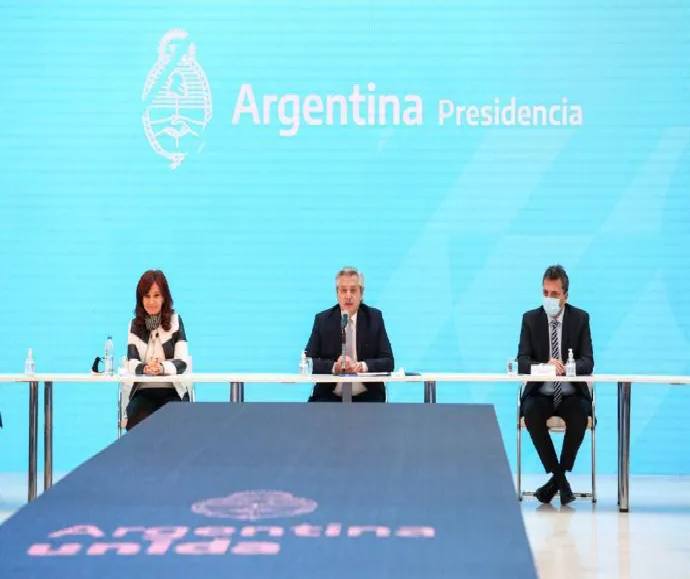 El Presidente realiza el anuncio junto a su vicepresidenta, Cristina Fernández de Kirchner, y el ministro de Economía, Martín Guzmán.