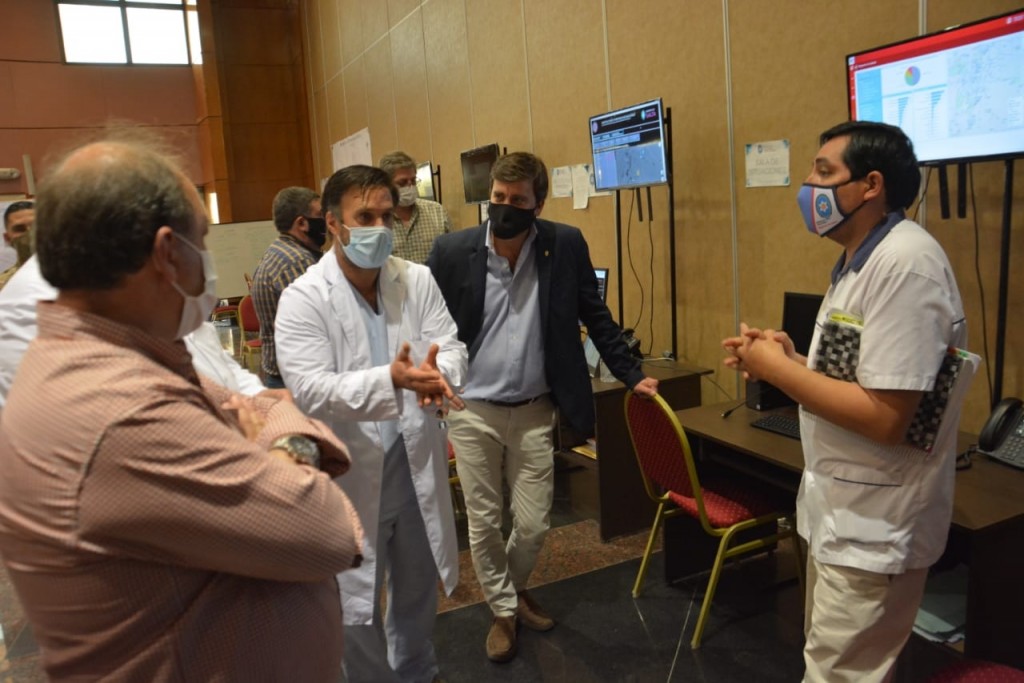 Durante la recorrida por el Central de Operaciones de Control y Seguimiento Covid-19, del que también participaron el secretario General de la Gobernación, Matías Posadas; los ministros de Gobierno, Derechos Humanos, Trabajo y Justicia, Ricardo Villada y de Seguridad, Juan Pulleiro, se mostró como funciona el tablero de seguimientos de casos, la disponibilidad de camas tanto en el sector público como privado.