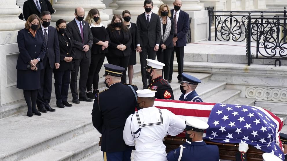 Los miembros de la familia observan cómo el ataúd cubierto con la bandera de la juez Ruth Bader Ginsburg es transportado por una guardia de honor militar al Capitolio de los Estados Unidos.Foto:Alex Brandon / AP