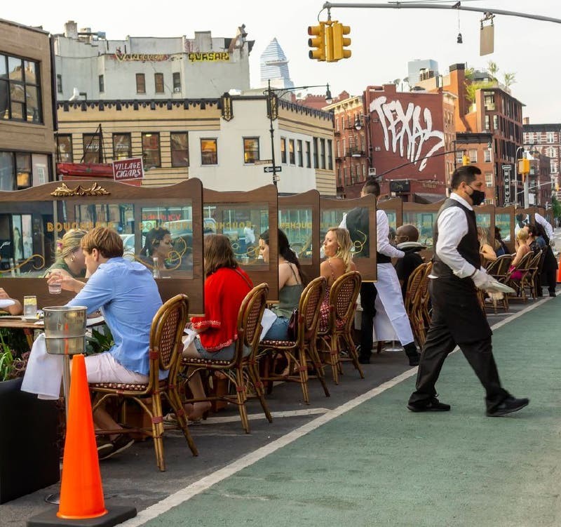 Más de 10,000 establecimientos se apuntaron desde junio pasado a esta iniciativa que salvó unos 90,000 empleos, de acuerdo con la alcaldía, y que cambió la imagen de las calles neoyorquinas con decoraciones de carpintería, luces y plantas para hacer más agradable la estancia de los comensales en las bulliciosas calles.