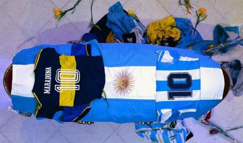 El féretro donde descansan los restos de Diego Maradona. Foto: Presidencia.