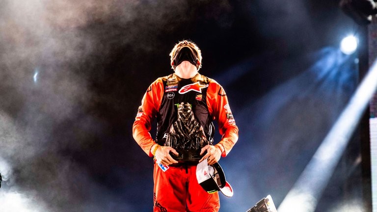 Su herida en la nariz es una de las marcas de guerra. Esa guerra llamada Rally Dakar que en 2021 tuvo doce batallas que fueron sus etapas (7.658 kilómetros), donde al final Kevin Benavides cantó victoria. El salteño hizo historia a darle a nuestro país y a Latinoamérica el primer triunfo en motos. Su rostro de cansancio es elocuente, pero también su alegría por alcanzar el sueño de toda su vida. El piloto oficial de Honda luce con orgullo el mítico Touareg, el trofeo al vencedor que afirma que “no me lo despego ni un minuto. Hasta duermo con él”. Luego de ganar la carrera más dura del mundo, un largo viaje desde Arabia Saudita y recién llegado a la Argentina, habla en la entrevista sobre su participaciòn en el Dakaar 2021.