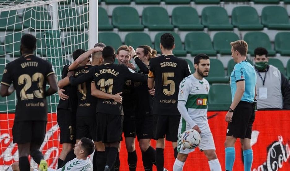 El Barcelona, sin Lionel Messi que cumple su segunda y última fecha de suspensión, venció al Elche por 2 a 0 con goles de Frenkie de Jong y Riqui Puig por uno de los partidos de la fecha 20 de La Liga de España.