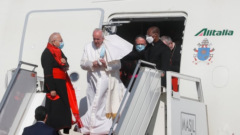 11.08: El papa bajó del avión con mascarilla y ya pisó suelo iraquí. Fue recibido por el primer ministro del país, Mustafa Al-Kadhimi.
