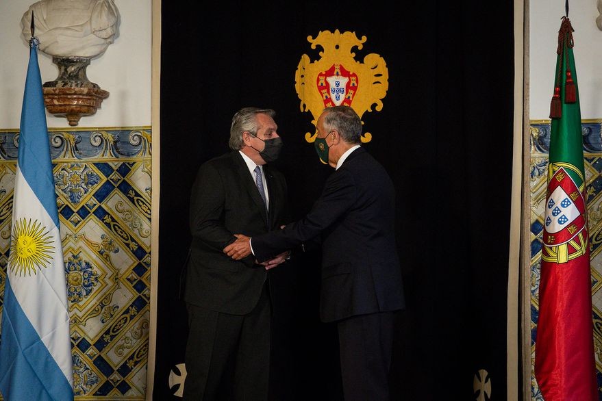 Alberto Fernández y su par portugués, Marcelo Rebelo de Sousa, ayer, en el Palacio Belem de Lisboa. Foto: Carlos Costa