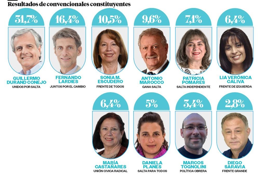 Con los números que arrojaba el escrutinio provisorio al cierre, los convencionales electos por el departamento Orán eran Baltasar Lara Gros y Amelia Acosta (Unidos por Salta), Hugo Domínguez (Gana Salta), Laura Moyano (Frente de Todos), José Yampotis (Juntos por el Cambio) y Luis Eduardo Fara (Salta para Todos).