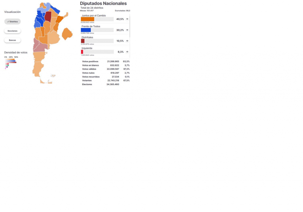 Juntos colocò sus listas de diputados nacionales ganaron en 15 provincias. La oposición se impuso de norte a sur, de Jujuy a Tierra del Fuego. Una victorial electoral que incluye a los cinco distritos más poblados del país: la provincia de Buenos Aires, la Ciudad Autónoma de Buenos Aires, Córdoba, Santa Fe y Mendoza.