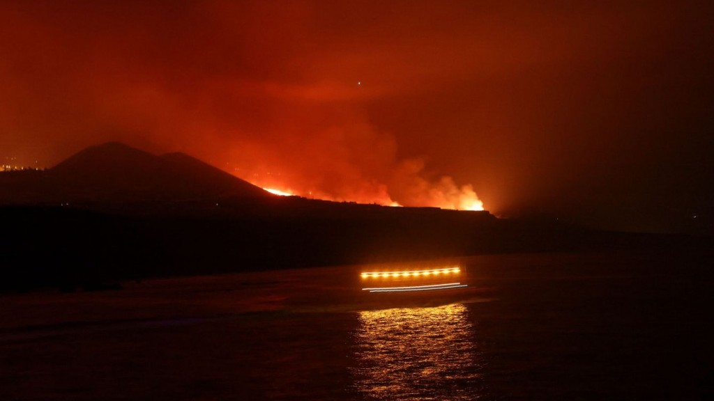 Imágenes de la televisión regional de Canarias, un archipiélago español en el Atlántico, mostraban imágenes en plena noche de la colada de lava cuando entraba en contacto con el agua, mientras se generaba gran cantidad de humo.