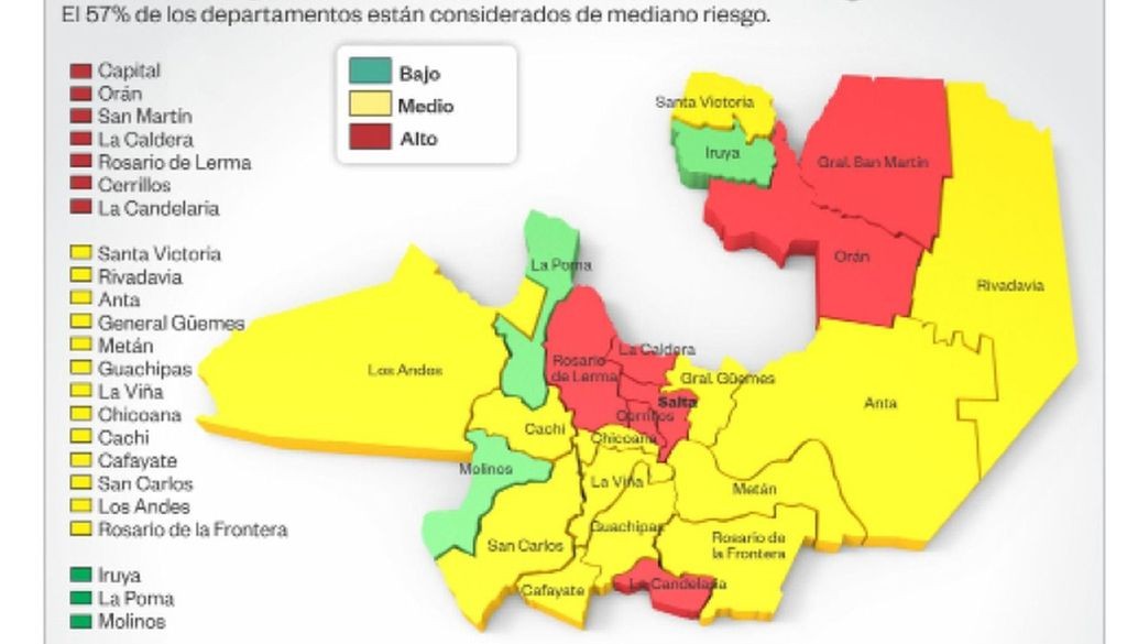 En tanto, se consideran de mediano riesgo Santa Victoria, Rivadavia, Anta, General Gemes, Metán, Rosario de la Frontera, Guachipas, La Viña, Chicoana, Cachi, Cafayate, San Carlos y Los Andes.