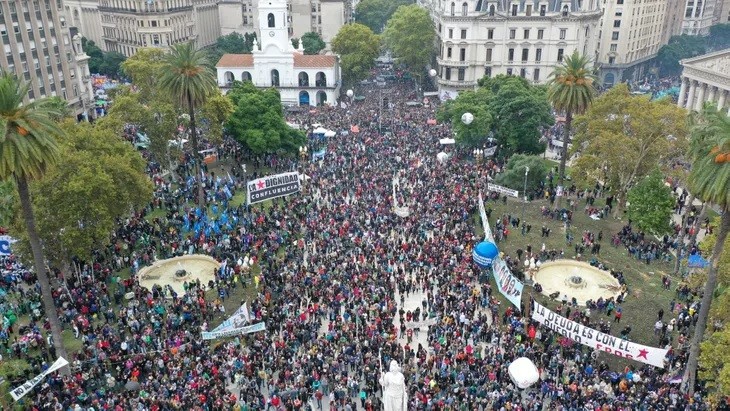 A la movilización se sumaron distintas organizaciones políticas, sociales, gremiales y de izquierda, que se concentran desde media mañana en varios puntos del centro porteño y ya empezaron a ingresar a la Plaza en masivas columnas.