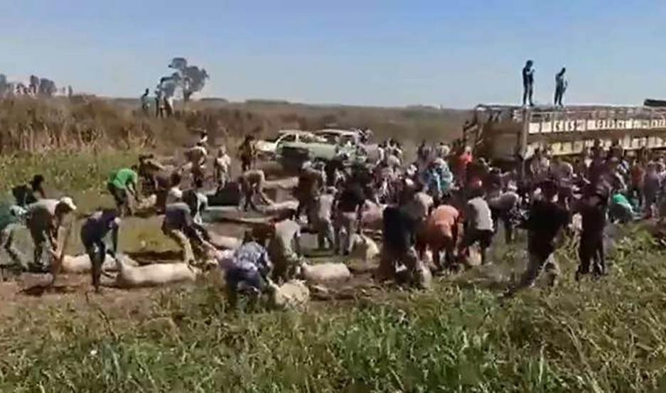 Tras el vuelco, el camión quedó cruzado sobre el asfalto y los animales desparramados por el lugar, algunos estaban vivos y otros muertos. Un grupo de personas que empezó a llevárselos y los arrastraron por el piso.