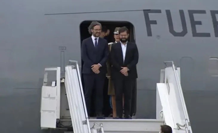 El presidente de Chile, Gabriel Boric, llegó esta tarde a la Argentina, en su primer viaje oficial al exterior, y fue recibido en el aeropuerto de Ezeiza por el canciller Santiago Cafiero.