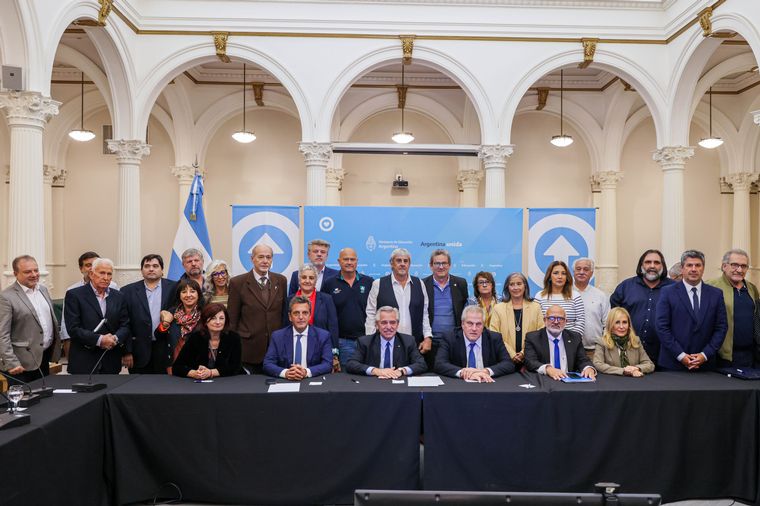 FOTO: Alberto Fernández y Sergio Massa junto a los gremios docentes.