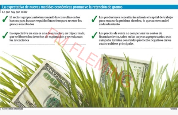 "Los precios están demasiado bajos. El productor se pregunta qué pasa si guarda el grano, si cambia el gobierno y bajan las retenciones y se liberan los derechos de exportación", coincidió Ernesto Ambrosetti, economista Jefe de la Sociedad Rural Argentina. "La soja se retiene para hacer frente a los pagos por granos y ante una expectativa de una devaluación. El maíz y el trigo, ante la expectativa de eliminar las trabas a las exportaciones", agregó. Aunque el respaldo financiero que se necesitaría es mayor porque al productor se le juntarían dos cosechas en un año.