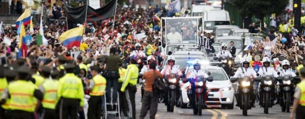 Hubo cerca de 7 000 voluntarios desplegados. Verónica Baldeón coreó las canciones que desde hace un mes y medio practicó con sus compañeros. Quería agradecerle a Dios por ayudarla a superar un altibajo en su salud y por eso se inscribió en el grupo de voluntarios. Llegó a las 10:00 para organizar al equipo que estaba a su cargo. Caminó de un lado a otro ubicándoles en sus posiciones, aconsejándoles que el momento en que llegara el Papa no lo miren a él sino a la gente, para evitar que se aglomeraran. Su almuerzo fue un aperitivo que encontró en un puesto ambulante, de los muchos que se instalaron en los alrededores con comida, camisetas, llaveros, gorras, paraguas, plásticos, pañuelos con el rostro del Papa. Baldeón sintió cansancio y dolor en los pies, que solo le olvidó cuando vio a lo lejos las luces de las sirenas de la Policía, custodiando a Francisco. Primero, varias motos y después el papamóvil blanco, con las luces encendidas. Los vehículos con vidrios polarizados que seguían al Papa en el recorrido motivaron la reacción de personas apostadas en la 6 de Diciembre. Gritaron ¡Fuera Correa, fuera! en los segundos que duró el paso de la caravana. Los voluntarios les recordaron que no se trataba de un acto político. El Papa siguió su recorrido con el brazo derecho levantado para saludar a los quiteños y también a sus coterráneos argentinos que llegaron. Dos de ellos eran el matrimonio de Jesús Rambaudi y María Sosa. Ellos emprendieron un viaje por América hace tres meses. Llegaron a Ecuador el 25 de mayo y tenían previsto quedarse solo 15 días. Pero cuando se enteraron que el Papa llegaría a Ecuador se quedaron. Ayer lo esperaron tomando mate en la intersección de la 6 de Diciembre y Gaspar de Villarroel.