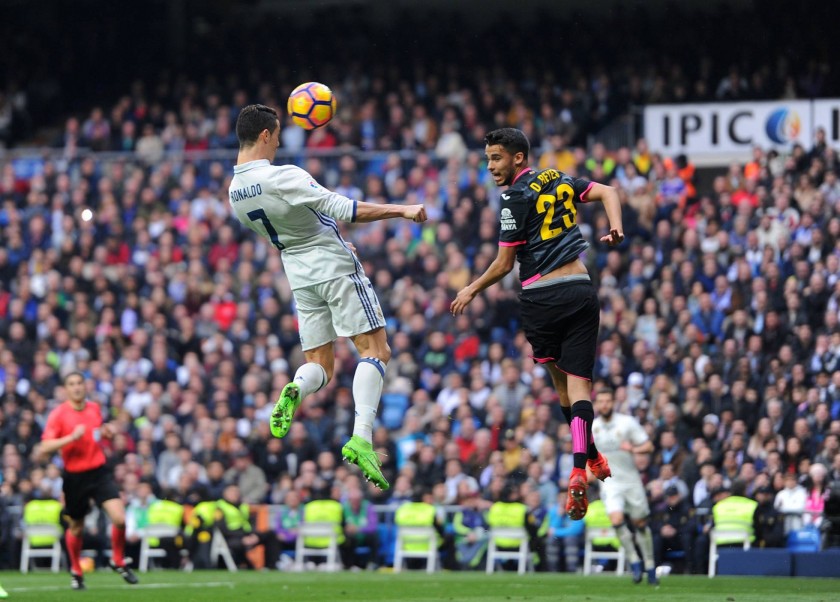 Cristiano Ronaldo, acostado de nuevo en la banda izquierda, trató de desbordar a su par y dejó detalles de calidad, como un genial regate a David López que levantó los aplausos del Santiago Bernabéu. Se vistió de nuevo de asistente el portugués, que en todo momento trató de encontrar portería aunque siempre pendiente de los desmarques de sus compañeros. Sin embargo, el primer gol del Madrid llegó gracias a un gran centro de Isco que Morata envió al fondo de la red con un cabezazo magnífico. El canterano suma así su undécimo gol de la temporada, el séptimo en Liga.