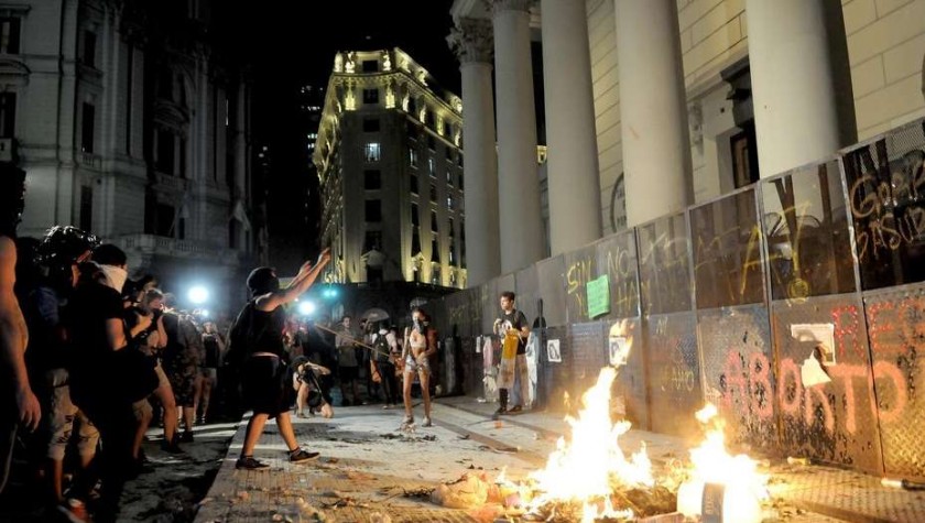 Los incidentes comenzaron cuando tres o cuatro manifestantes mujeres, con pañuelos en la boca, hicieron una fogata a pocos metros de la Catedral, al mismo tiempo que arrojaban elementos y pateaban el vallado, detrás del cual se encontraba la Policía. Un grupo de pocas decenas de personas observaba el episodio sin intervenir.