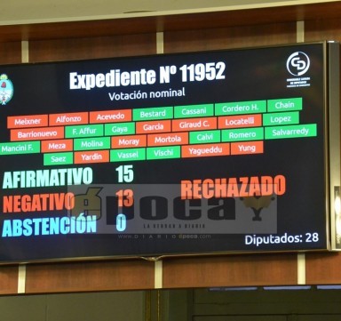 Una veintena de legisladores expusieron sus posturas y fue finalmente el presidente de la cámara Pedro Cassani quien tras bajar a su banca y argumentar su voto afirmativo llamó a la votación nominal. 15 legisladores votaron afirmativamente y 13 por la negativa. El número no fue suficiente teniendo en cuenta que para el proyecto intervencionista se requería dos tercios del cuerpo tal como lo indica el artículo 236 de la Constitución Provincial.