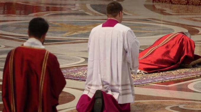 El papa Francisco oró postrado durante un servicio religioso con motivo del Viernes Santo en la Basílica de San Pedro. El pontífice de 80 años permaneció varios minutos frente al altar. Llevaba puesta vestimenta carmesí en el día que se conmemora la crucifixión de Jesús.