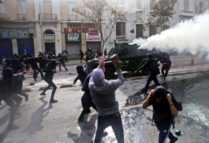 En Santiago, miles de estudiantes -con tambores y banderas- marcharon por la céntrica avenida Alameda, generándose algunos enfrentamientos entre encapuchados y la policía hacia el final de la manifestación.